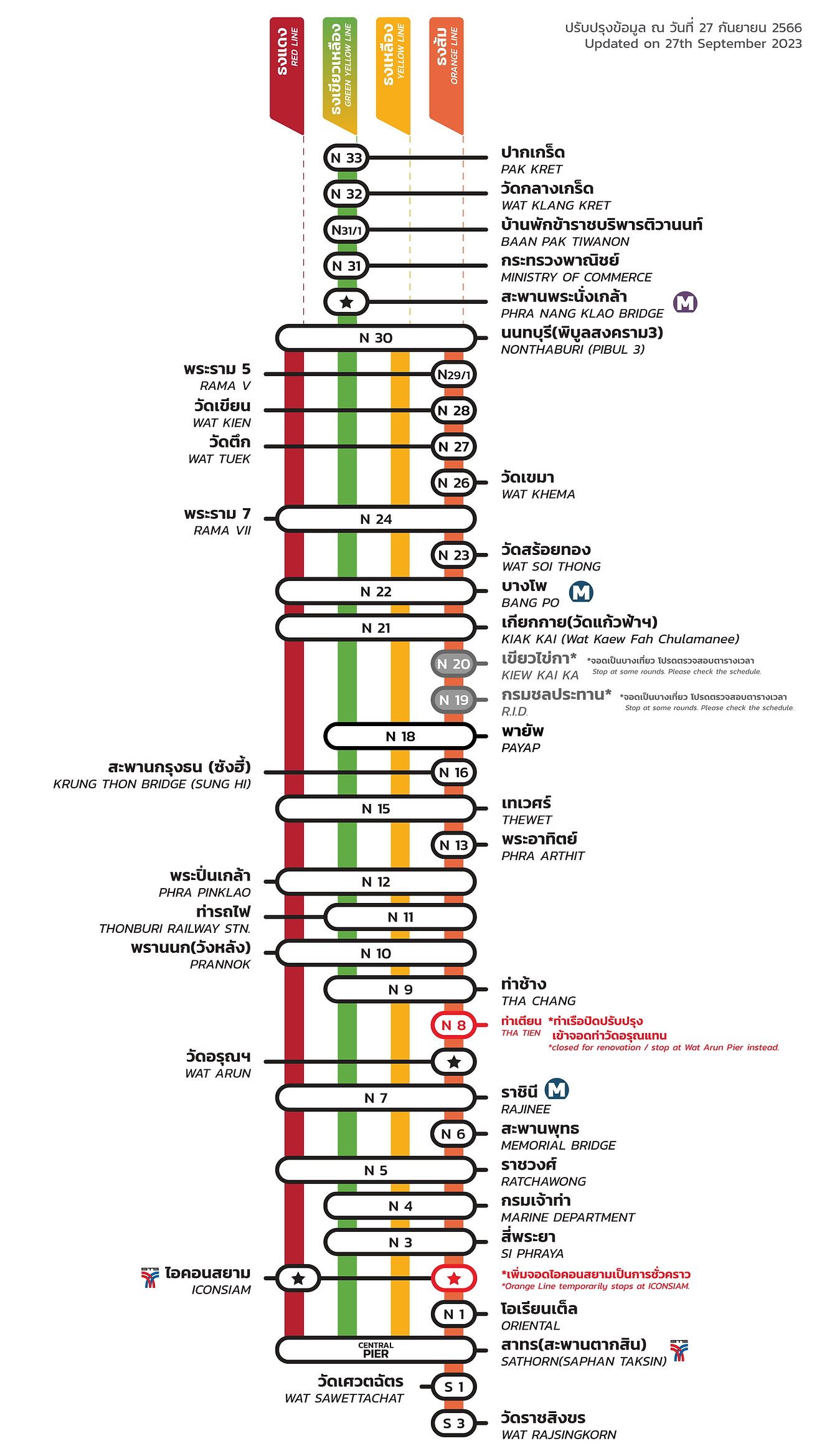 – Yellow Line and Green Yellow Line: These boats stop at fewer stops, thus provide a more efficient service. The fare is slightly more expensive at 21 baht (flat rate).